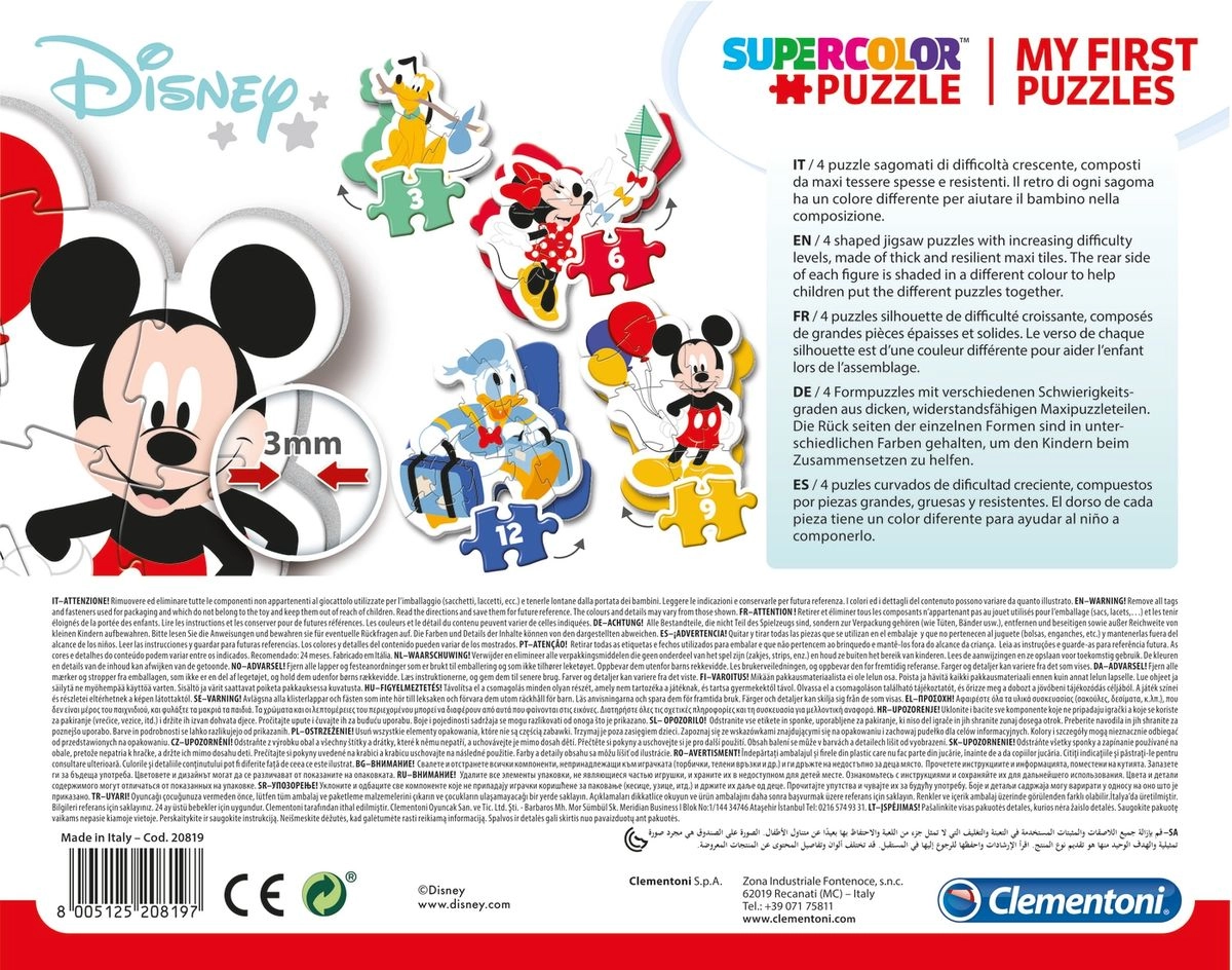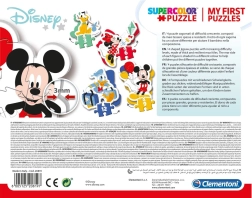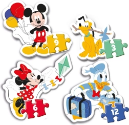 Štiri barvite sestavljanke z motivom MICKEY MOUSE za najmlajše ponujajo postopno sestavljanje s 3, 6, 9 in 12 koščki. Veliki in trdni koščki debeline približno 3 mm so enostavni za prijem malih rok, podpirajo ročnost, koordinacijo oko–roka in prostorsko orientacijo. Idealno od 2 let.
