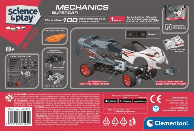 Ta mehanski laboratorij znamke Clementoni spremeni otroke v male inženirje. Zahvaljujoč funkcionalnim elementom, kot sta pravokotni menjalni prenos in krmilni mehanizem z zobato letvijo, se mladi graditelji naučijo principov mehanike in konstrukcije, medtem ko uživajo ure zabave pri gradnji hitrega modela dirkalnega vozila.