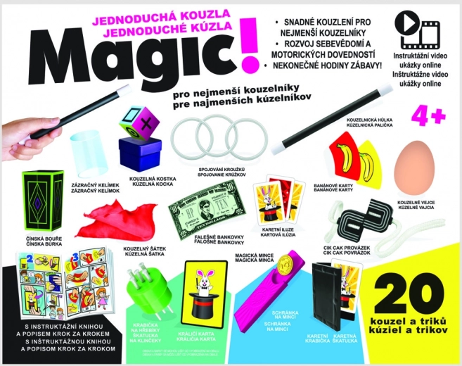 SUPER enostavna magija, komplet 20 trikov. S to razkošno zbirko čarobnih rekvizitov in s pomočjo nekaterih vsakdanjih predmetov boste lahko izvajali 20 neverjetnih čarovnij, trikov in iluzij. Vsebuje najsvetlejša navodila korak za korakom, zato lahko tudi najmlajši čarodeji hitro razvijejo svoje veščine. Postanite mojstri in umetniki »magije«! Starost 4+, slikovni priročnik + spletna navodila