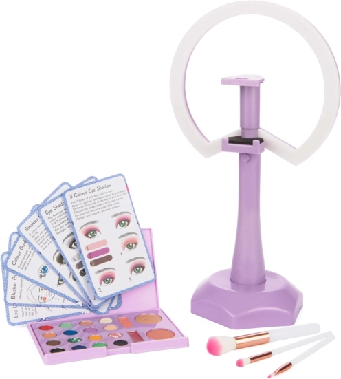 - 3 čopiči, paleta senčil za oči, šminke, rdečila, LED lučka, kartice s postopki