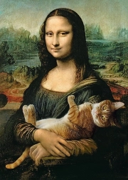 Motiv Mona Lise z muco Mruczkom dodaja klasični umetniški sceni zabaven in igriv element.