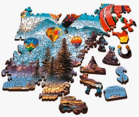 Puzzle so obojestranske – na eni strani čudovita slika, na drugi stiliziran vzorec – in vsebujejo približno 100 posebej oblikovanih koščkov, ki spominjajo na slavne stavbe, živali ali prevozna sredstva. Preostali koščki imajo nepravilne oblike, ki povečajo zabavo in izziv. Del pakiranja je tudi predloga za lažje sestavljanje ter ekološka embalaža brez plastike.