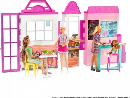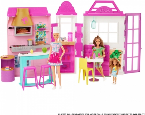 Doživi veliko zabave v moderni restavraciji BARBIE z več kot 30 kosi dodatkov, 6 igralnimi območji in punčko v kuharskem outfitu. Otroci lahko sprejemajo naročila, posedajo goste, pečejo burgerje na žaru, pečejo pico, ki menja barvo, in strežejo sladice na vrtljivem pultu – vse v enem elegantnem setu.