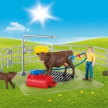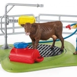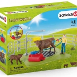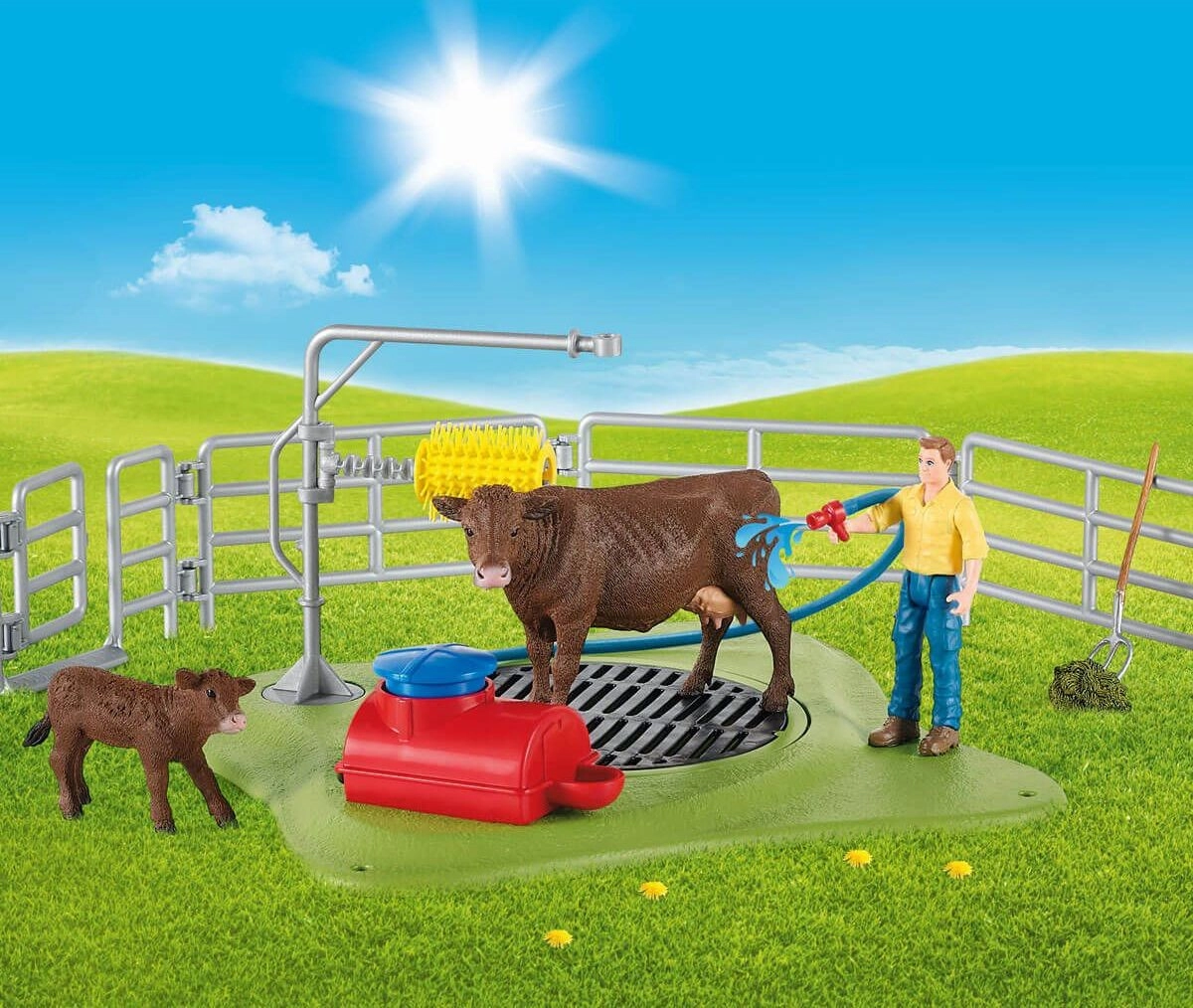 Set vsebuje vse potrebno: figurice krave, telička in kmeta, poleg tega pa dodatke, kot so cev, črpalka s funkcijo škropljenja, krtača za krave, vrbove ograje in vrata. Kakovostne, ročno poslikane podrobnosti, značilne za SCHLEICH, spodbujajo domišljijo in podpirajo igranje vlog s kmetijsko tematiko.