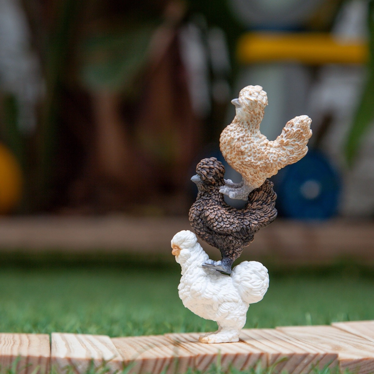 Otroci bodo cenili vzdržljivo plastiko, stabilno držo in tri različne barvne izvedbe, s katerimi kokoši zlahka razlikujejo. Komplet je idealen za samostojno ali skupinsko igro, spodbuja razvoj fine motorike, domišljije in pripovedovanja zgodb.