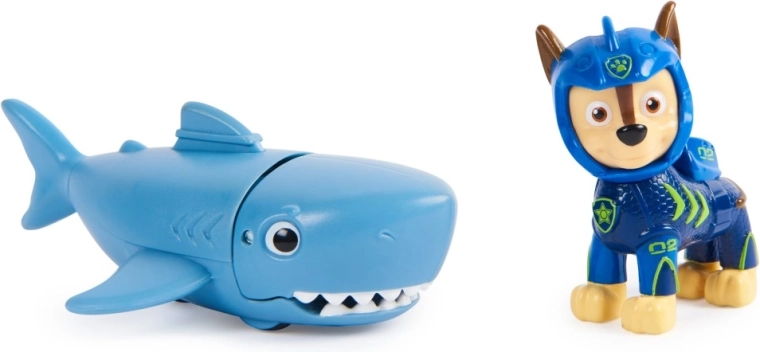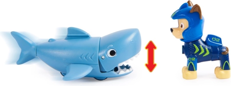 Figurica Chase je oblečena v nov neopren, da je pripravljena na katero koli podvodno reševalno akcijo. Otroci lahko Chasa pritrdijo na hrbet njegovega prijatelja morskega psa in z enostavnim potiskom naprej aktivirajo ugrizni mehanizem. Avtentični detajli in dizajn, navdihnjen s serijo „Tačke na patrulji“, omogočajo otrokom ure zabave in raziskovanja ustvarjalnih reševalnih misij.