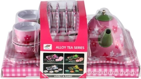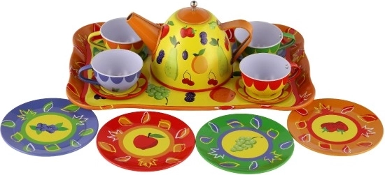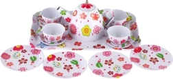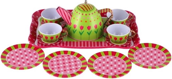 Ta otroški pločevinasti čajni set prinaša otrokom veselje ob namišljenem strežbi in družabni igri. Set je izdelan iz kovine, zato je trden, vzdržljiv in lahek za majhne roke. Barviti motivi cvetlic, metuljev ali sadja spodbujajo ustvarjalnost in domišljijo, medtem ko servirni pladenj olajša prenašanje in igro.