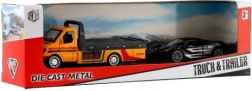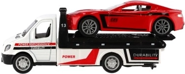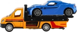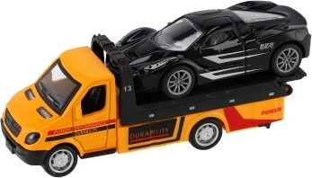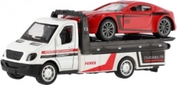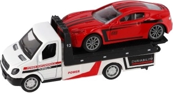 Ta realistično izdelano vlečno vozilo z naloženim športnim avtomobilčkom razširi otroški vozni park z priljubljenim delovnim vozilom. Z vzmetnim navijanjem (pull-back) je dovolj pritisniti, spustiti in opazovati akcijo – popolno za prizore iz mesta, s ceste ali delavnice.