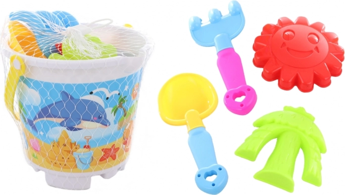 Komplet za pesek z vedrom (17 cm), lopatko, grabljicami in 2 modelčkoma. Pakirano v mrežici. Za otroke od 3 let – idealno za peskovnik in plažo.