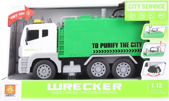 Brizgalna gasilska cisterna na baterije z lučmi in zvoki, brizga vodo iz cevi. Baterije priložene, mere 29×13×10 cm. Odlična igrača za otroke od 3 let.