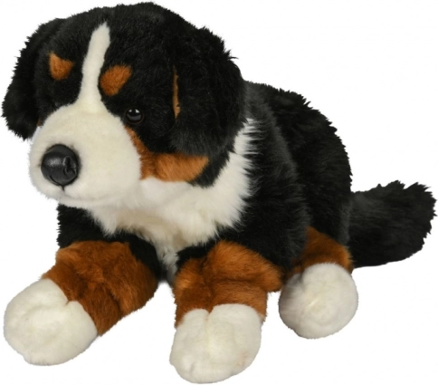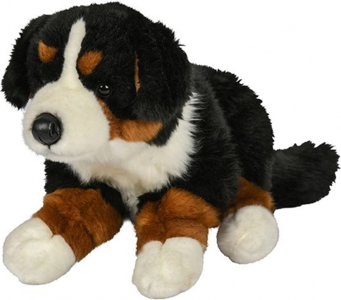 Plišasti pes zvesto posnema videz pravega bernskega planšarskega psa, vključno z njegovim značilnim črno-belim kožuhom.