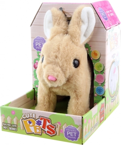 Plišasti zajček na baterije. Zajček skače, oddaja zvoke in miga z repkom. Napajanje z 2 baterijama AA (nista priloženi). Dimenzije zajčka približno 15 × 19 × 7,5 cm. Dimenzije embalaže približno 13 × 19 × 18 cm (služi tudi kot hišica). Starost 3+