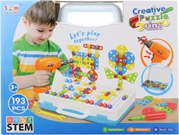 Ta bogato opremljena vijačna sestavljanka je idealna za male konstruktorje. Zaradi baterijskega električnega vrtalnika in ročnega izvijača lahko otroci preprosto povezujejo dele, ustvarjajo oblike in sestavljajo različne modele. Praktičen kovček zagotavlja, da bodo vsi elementi vedno pri roki in varno shranjeni.