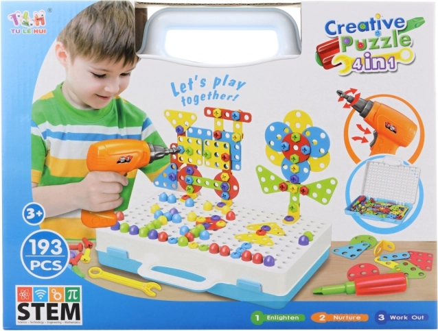 Zabavna in kreativna vijačna sestavljanka z električnim vrtalnikom za otroke od 3 let ponuja skupaj 193 kosov za sestavljanje najrazličnejših modelov. V kompletu so baterijski vrtalnik, izvijač in praktičen plastičen kovček za pregledno shranjevanje. Ne manjka niti navodilo za lahek začetek ter veliko prostora za razvoj fine motorike, kreativnosti in logičnega razmišljanja.