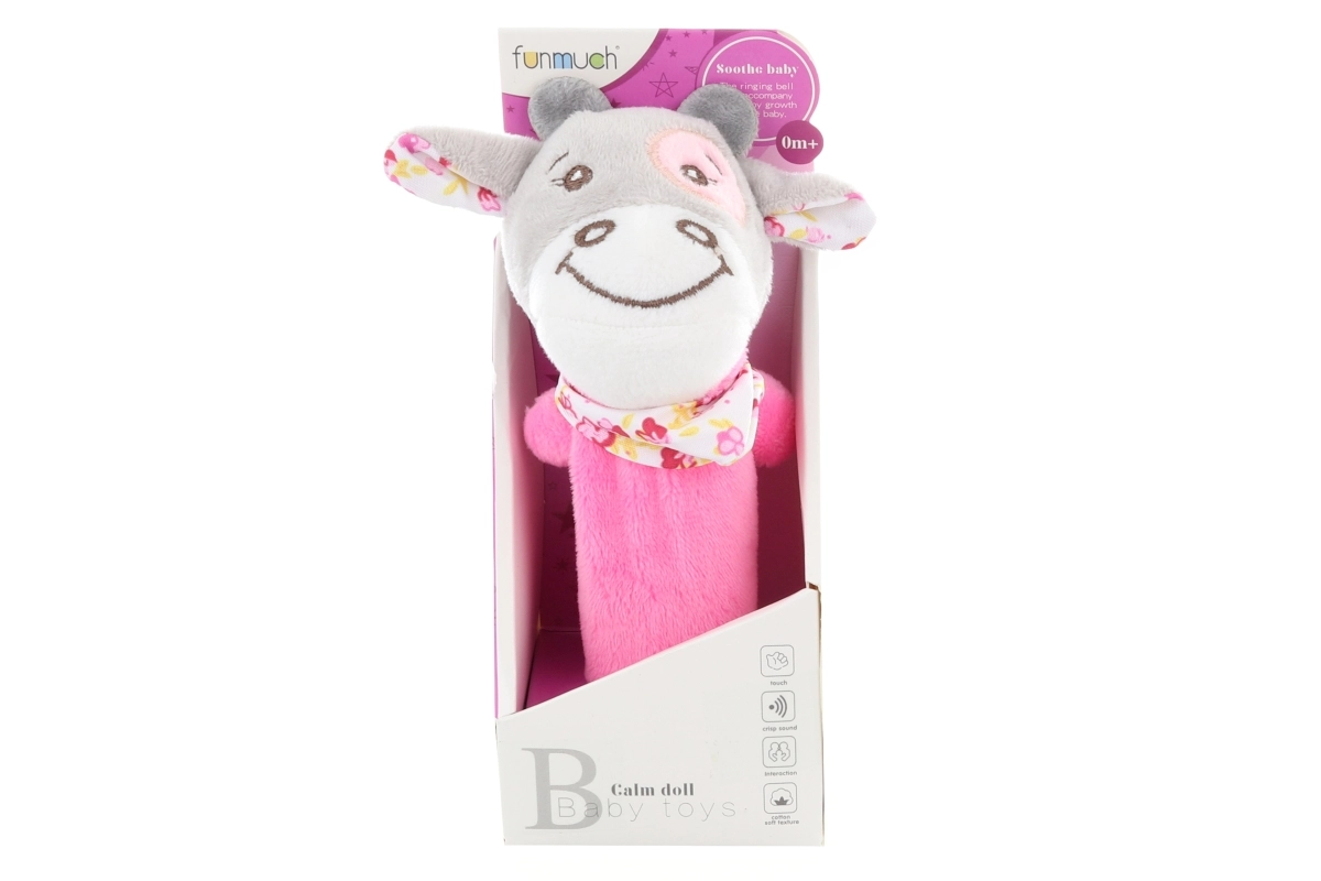 Ta piskajoča ropotuljica v podobi rožnate kravice je mehka na dotik in zasnovana za najmlajše uporabnike. Ob stisku oddaja nežen piskajoč zvok, ki pritegne pozornost in spodbuja razvoj sluha. Zaradi kompaktnih mer jo je enostavno držati, zato je idealna za vadbo fine motorike in prijema.