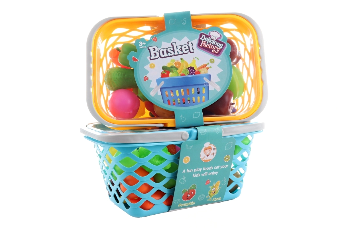 Ta barvit set plastičnega sadja in zelenjave v košarici bo razveselil vsakega malega ljubitelja kuhanja in nakupovanja. Košarica z zračno mrežo in pokrovom služi kot praktičen shrambni prostor in prenosna torba, zato lahko otroci svojo opremo vzamejo na katerokoli igro.
