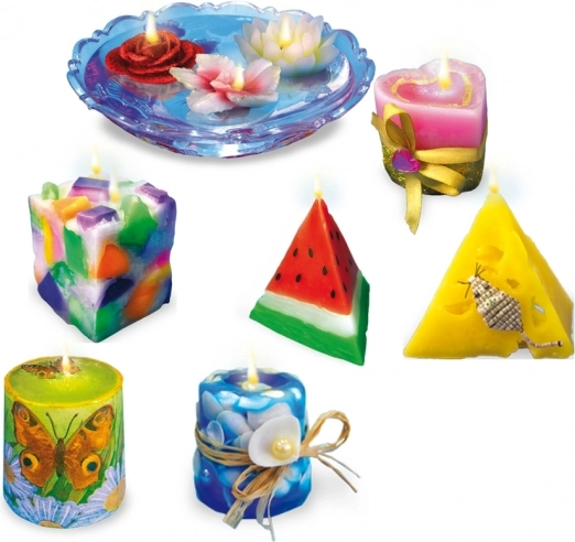 S tem velikim kompletom si lahko v udobju doma izdelate do 9 sveč. Različne barve in oblike sveč (srce, melona, morska, plavajoča, sir in miš, mozaik itd.). Paket vsebuje vse potrebno za izdelavo (parafin, vlivne forme, barvilo, stenja, akrilne barve, lepilo, bleščice, steklene perle, satenaste trakove itd.). Komplet vsebuje npr. voščen osnovni material, šablone, lončke, modelčke, žičko, perle, školjkice, okrasni prtiček, barve, trak, lepilo, vrvico, voščenke in še mnogo drugega. Dimenzije embalaže 30 x 44 x 6 cm. Starost 7+. IZDELANO V EVROPI