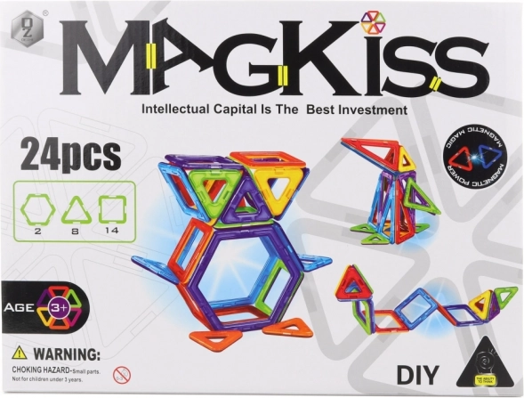Preizkusite magnetno sestavljanko MagKiss, ki ponuja ne le zabavo, temveč tudi podporo razvoju in ustvarjalnosti vaših otrok. Komplet vsebuje 24 delov v oblikah trikotnikov, kvadratov in šesterokotnikov. Zaradi svoje preprostosti in vsestranskosti je sestavljanka primerna za sestavljanje kakršnihkoli domišljijskih oblik.