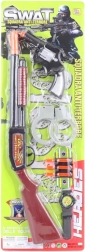 Komplet orožja za otroke vsebuje puško, revolver, lisice, uro in tri naboje s priseskom, idealno za igro in razvoj otroške domišljije.
