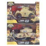 Vojaški set, ki vsebuje oklepno vozilo in vojaka, idealen za male vojaške navdušence. Top vozila omogoča izstreljevanje oranžnih raket za realistično akcijo.