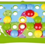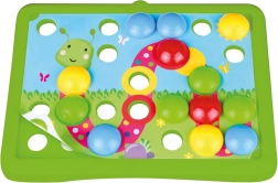 Odkrijte ustvarjalno igro, ki razvija domišljijo in spretnosti. Otroci vstavljajo barvne žebljičke v predloge z motivi narave (npr. gosenica, rože ali živalice) ter vadijo natančnost, potrpežljivost in prepoznavanje barv. Velike luknje in žebljički se dobro držijo in olajšajo rokovanje malim rokam.
