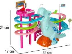 Zabavna dirkalna steza z velikim dinozavrom, ki “požira” male dinozavre–avtke, otrokom ponuja ure igre, polne svetlobe in zvokov. LED učinki, rjoveči dinozaver in samodejno gibanje, ki ga upravlja ena stikalo, razvijajo motoriko, koordinacijo oko–roka in ustvarjalnost. Napajanje z AA baterijami ali priloženim USB kablom.