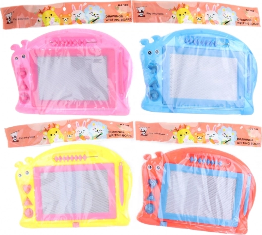 Zabavna plastična risalna tablica v obliki polža bo razveselila vse male umetnike. Ponuja preprosto risanje in brisanje s priloženim svinčnikom, spodbuja fino motoriko in ustvarjalnost. Idealna za na pot ali domov, s kompaktno velikostjo in varno zasnovo za otroke od 3 let.