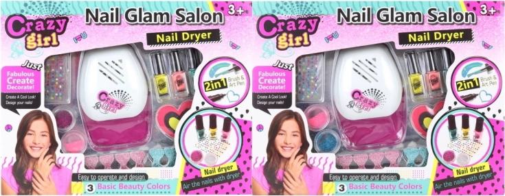 Otroški nohtni studio s sušilnikom je odlična seta za male stilistke. Vsebuje vse potrebno za prvo manikiro: sušilnik za nohte na baterije, 3 barvne lake, pilico, bleščice in druge dodatke. Idealno za ustvarjalno igro in razvijanje domišljije. Starost 3+.