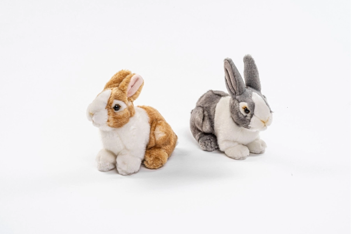 Realistične podrobnosti, kot so pokončna ušeska in umirjene barve, zajčku dodajo čar, medtem ko kakovostni šivi in prijeten material zagotavljajo varno in udobno crkljanje za najmlajše.
