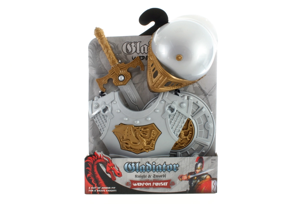 Del kompleta sta dekorativni meč in ščit, ki ju dopolnjujeta prsni oklep in čelada za avtentičen videz. Komplet je izdelan z mislijo na udobje in enostavno oblačenje, zato je primeren za kostume, karneval in prosto igro.