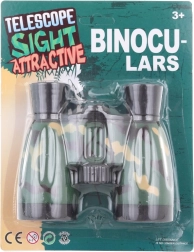 Plastični daljnogled v maskirnem vzorcu, velikosti približno 13,5 × 12 × 5 cm. Dimenzije embalaže približno 17 × 22 × 5,5 cm. Starost 3+.