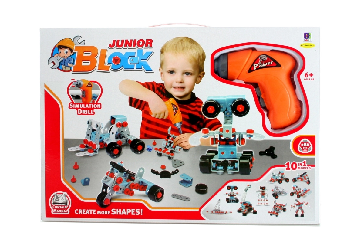 Konstrukcijski set Junior Block je odlična izbira za male konstruktorje, ki imajo radi vijačenje in raziskovanje. Zahvaljujoč bogatemu setu 286 vzdržljivih plastičnih delov, koles in konektorjev lahko otroci sestavljajo raznolike modele 10v1 – od vozil prek robotov do izvirnih stvaritev po lastni domišljiji.
