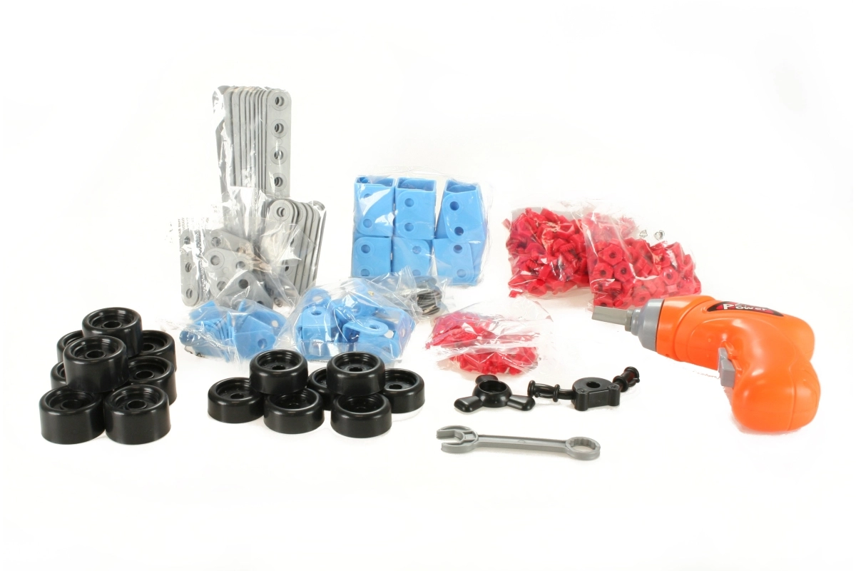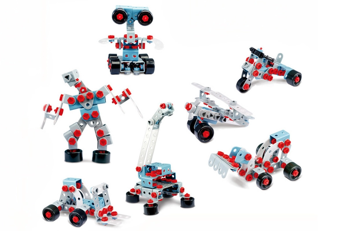 Modularni nosilci, konektorji, kolesa in vijaki omogočajo večkratne predelave. Idealno za razvoj fine motorike in tehničnega razmišljanja.