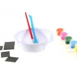 - Mavec, plastična posodica, plastični kalup s 6 motivi, 6 barvic, čopič, magneti, navodila