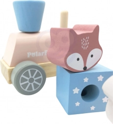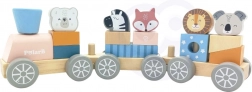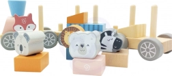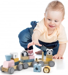 Vlak je zasnovan tako, da spodbuja otroško kreativnost in koordinacijo fine motorike z zlaganjem kock in živalc.