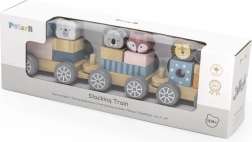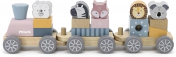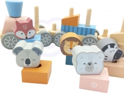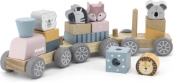Del te igrače je lokomotiva s tremi pritrjenimi vagoni, ki omogočajo raznoliko zlaganje in kombinacije blokov okrašenih z živalcami. Med igro otroci razvijajo sposobnost reševanja problemov in koordinacijo gibov.
