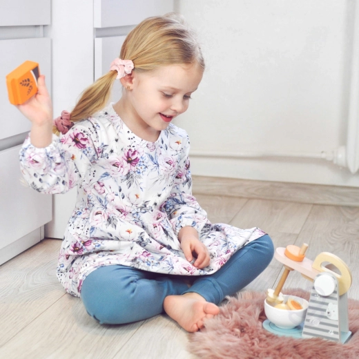 Mešalnik ima vrtljivo roko in premično metlico, ki otrokom omogočata realistično igro s kuhinjskimi pripomočki.