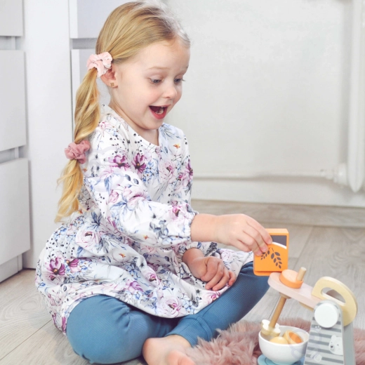 Ta rožnato-sivi mešalnik z nagibno roko in stilskimi oblikovnimi elementi otrokom omogoča simulacijo kuharskih veščin pri igri vlog. Mešalnik ima priročen ročaj, zato lahko otroci enostavno vložijo ali vzamejo posodo, kar spodbuja njihove motorične sposobnosti.