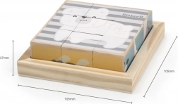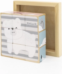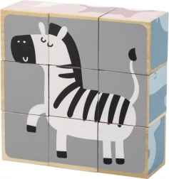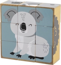Odkrijte brezčasno leseno igračo, ki otroke zabava in uči. Iz 9 kock ustvarite skupaj 6 različnih motivov živalic – na primer medvedka, lisico, koalo, zebro ali ježa. Vsaka stran kocke pripada drugi sliki, zato si otroci urijo pozornost, potrpežljivost in prostorsko predstavljivost.