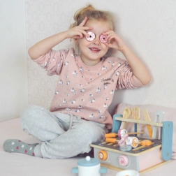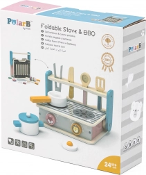 Ta stilska lesena kuhinjica 2v1 združuje klasično kuhanje z žarom. Zaradi zložljive konstrukcije jo zlahka prilagodite prostoru in željam malega kuharja. Dve kuhalni plošči z vrtljivimi gumbi igri dodata realističen pridih, otroci pa vadijo fino motoriko in domišljijo.