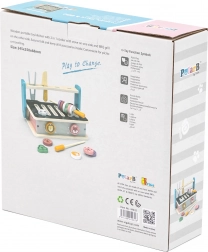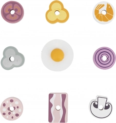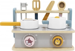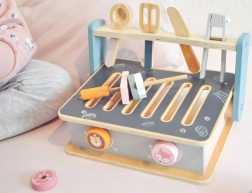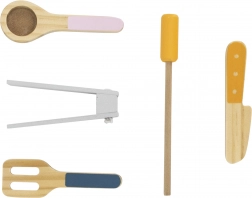 Dve posodi, nož, žlica, lopatica, klešče, palčke za ražnjiče in lesena živila (meso, jajca, zelenjava) spodbujajo domiselno igro vlog brez dodatnih nakupov.