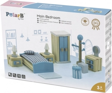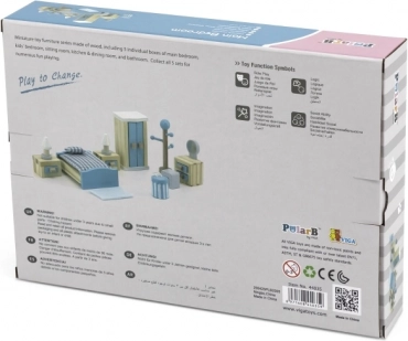 Lesena spalnica VIGA POLARB spremeni vsako hiško za punčke v prijeten prostor za igro. Komplet vsebuje posteljo, 2 nočni omarici, omaro, obešalnik, toaletno mizico s stolčkom, preprogo in košarico – vse v nežni modri in naravni barvi. Kakovostna izdelava, gladki robovi in netoksične barve zagotavljajo varno igro, bogata oprema pa spodbuja domišljijo, kreativnost in igranje vlog otrok.