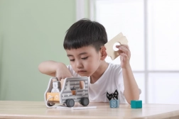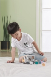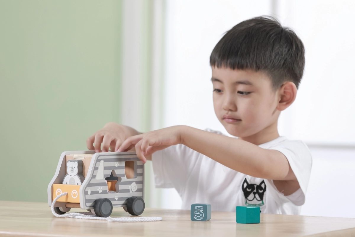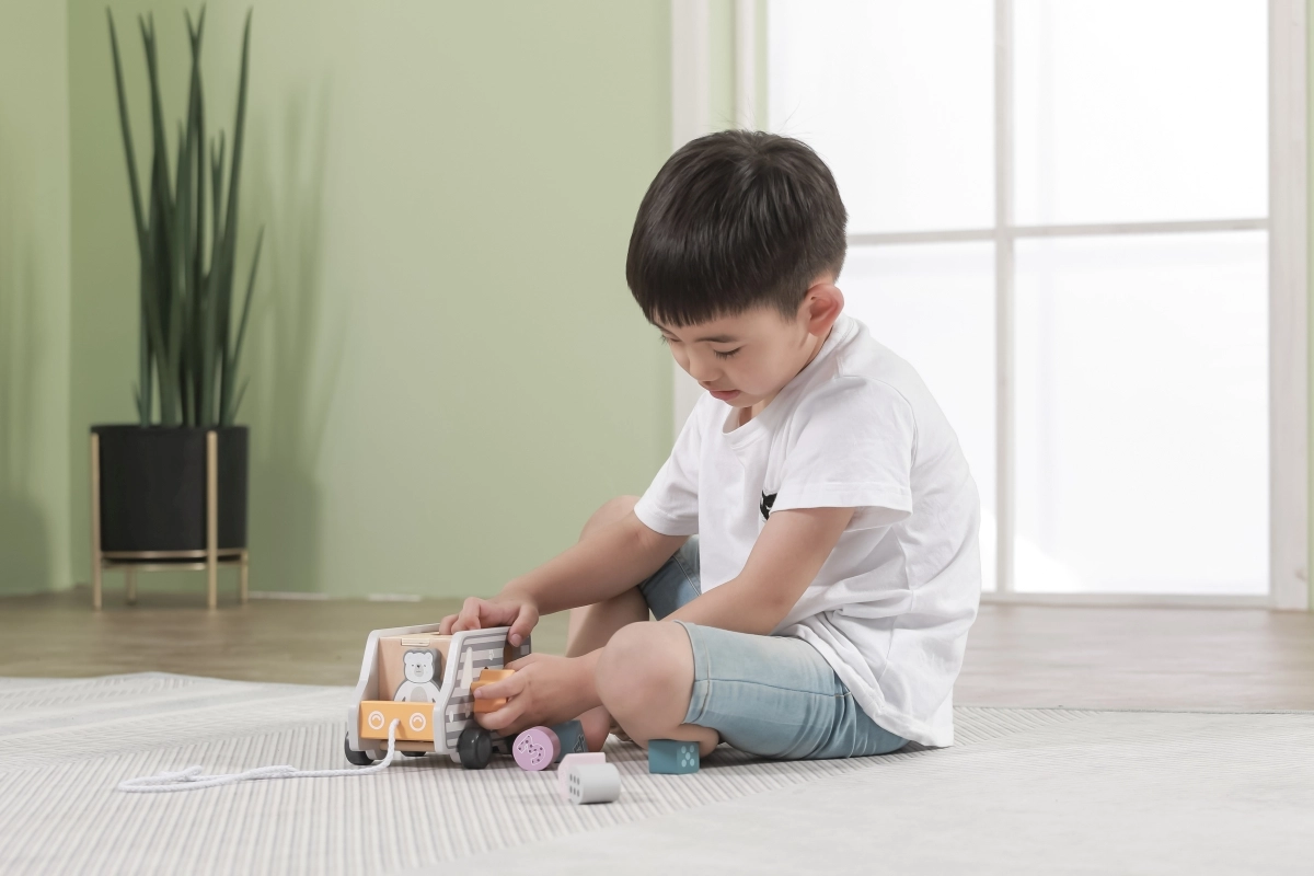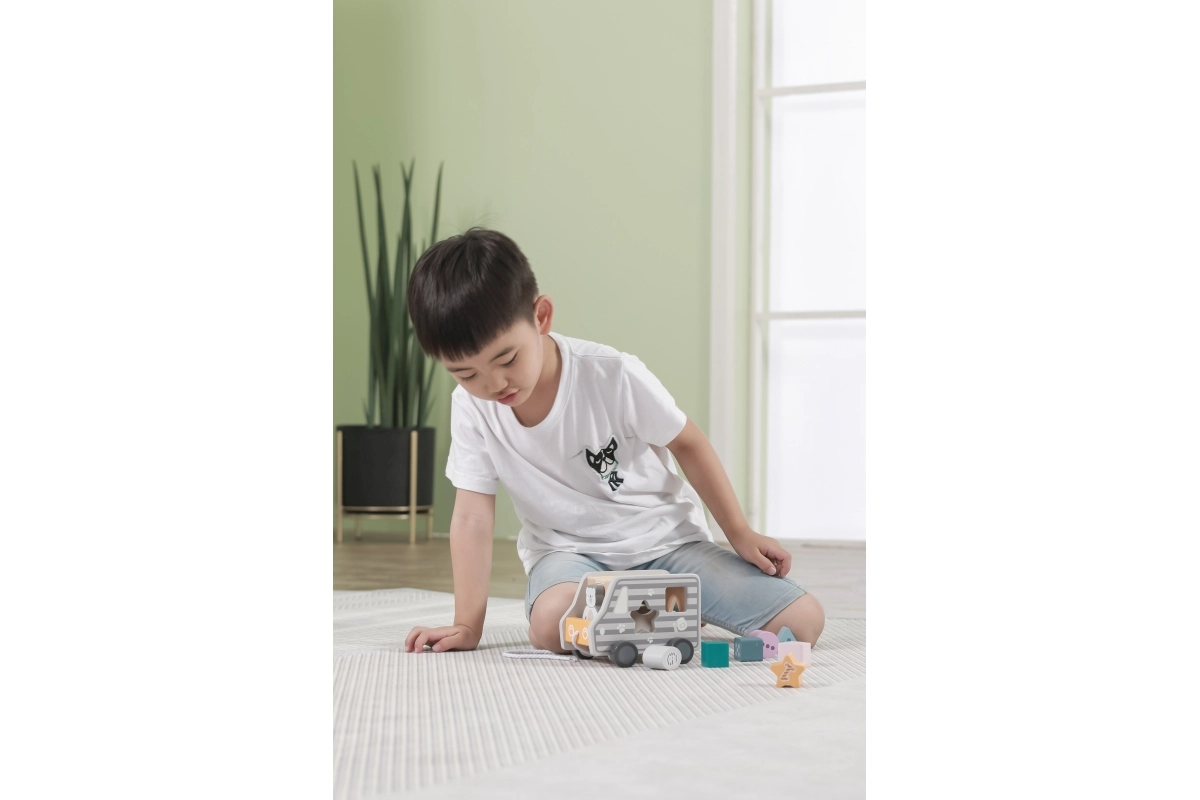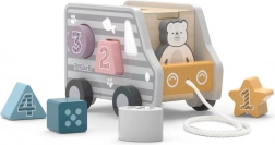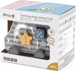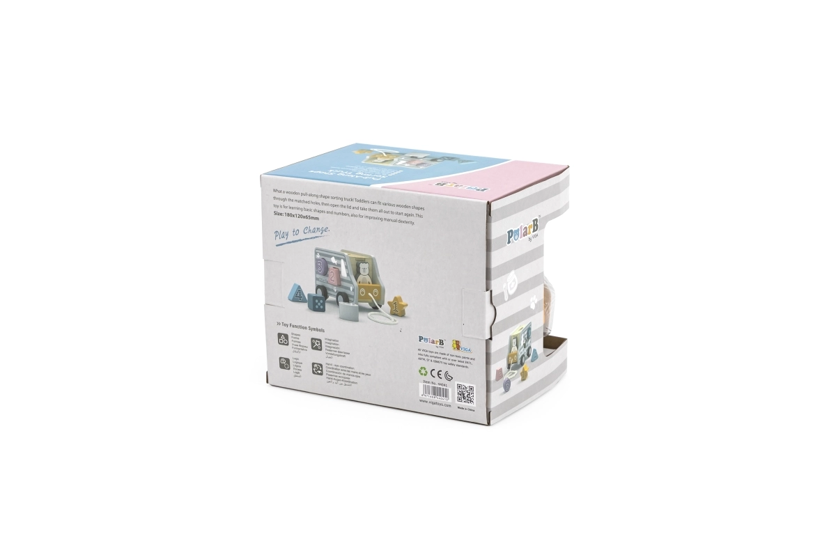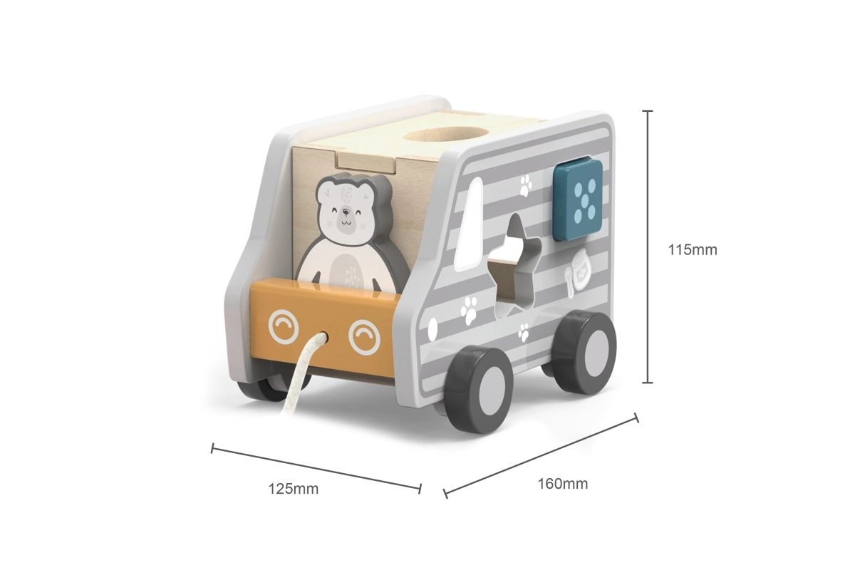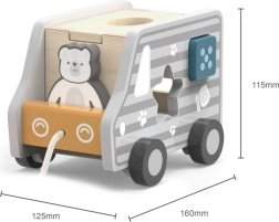 Lesena vleka in vstavljanka v obliki tovornega vozila. Mere približno 18 x 12 x 6,5 cm. Mere embalaže približno 19 x 16,5 x 13,5 cm. Starost 18+ mesecev.