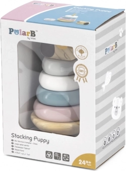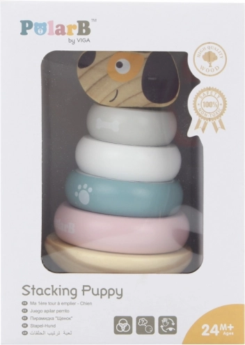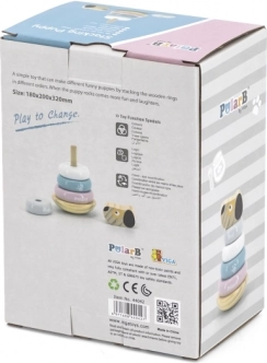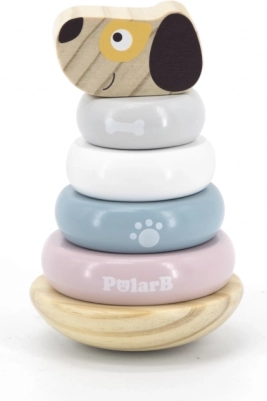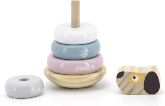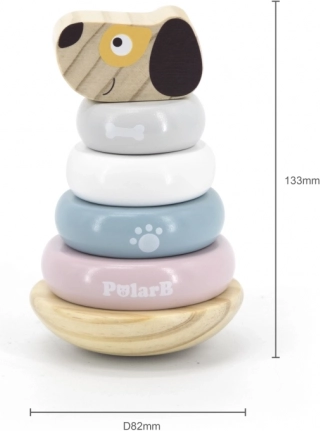Ta sestavljanka piramida z motivom kužka otrokom prinaša veselje ob odkrivanju in učenju. Gladki leseni deli v nežnih pastelnih barvah so enostavni za držanje tudi za majhne ročice, zlaganje obročev na palčko pa spodbuja koncentracijo, potrpežljivost in prostorsko predstavljivost. Stabilna osnova zagotavlja varno igro, simpatična kužkova glavica pa motivira k ponovnemu zlaganju.