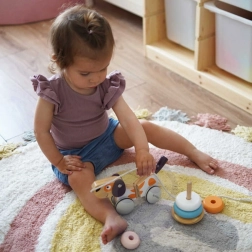 Igrača razvija koordinacijo, ustvarjalnost in domišljijo ter lepo dopolni zbirko lesenih igrač v umirjenih barvah. Primerna za vsakodnevno igro doma in na poti.