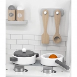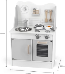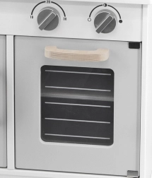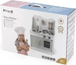 Stilna lesena kuhinjica POLARB v sivi izvedbi spremeni otroško sobo v majhen kulinarični studio. Vsebuje viseči umivalnik, pečico in kuhalnik ter je dobavljena z bogatim priborom za realistično igro. Vrtljiva preklopna stikala z zvokom »klik«, čitljiv kuhinjski časovnik in omarica za shranjevanje posode spodbujajo samostojnost, ustvarjalnost in zabavno učenje.