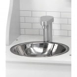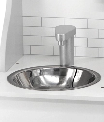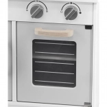 Kovinski umivalnik, dvo-ploščni kuhalnik in pečica z upravljalnimi gumbi, ki ob vrtenju klikatjo, ustvarjajo avtentično izkušnjo kuhanja.