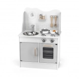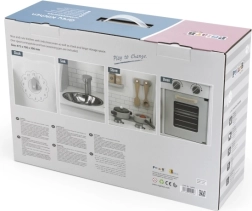 Del kompleta je bogat nabor dodatkov: lonec s pokrovko, ponev s pečenim jajcem, žlica, luknjičasta lopatka, spatula ter solnica in popernica. Vrtljiva 4 gumba z zvokom »klik« in pregleden zvončni časovnik igri dodajata realističen pridih. Spodnja omarica služi kot shranjevalni prostor za živila in posodo ter uči otroke reda.