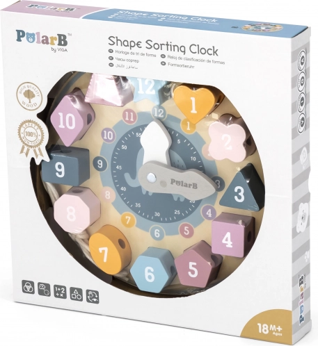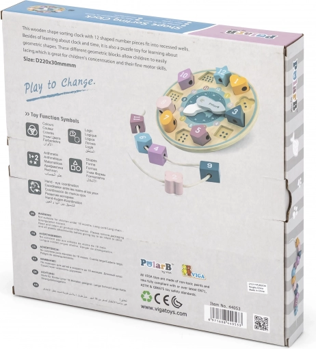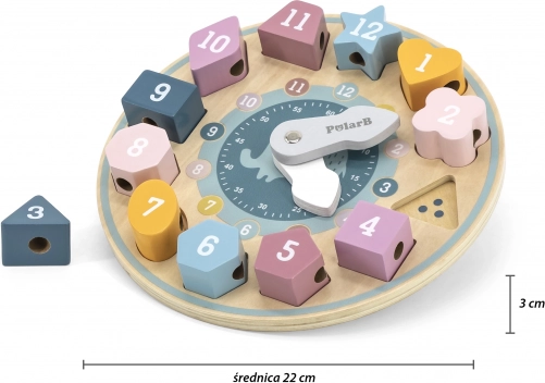 Jasno berljive številke, pikočasto označevanje za vizualno štetje in pastelne barve podpirajo razvoj predšolskih spretnosti. Bukov les in netoksične barve zagotavljajo varnost in dolgo življenjsko dobo. Igrača spodbuja samostojno raziskovanje in ponuja veliko načinov igre – od razvrščanja števil 1–12, preko ujemanja oblik do prvih korakov v določanju časa.