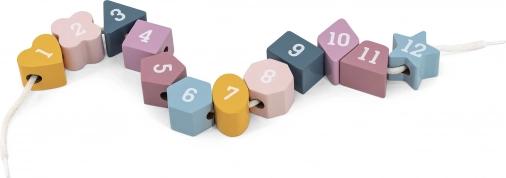 Vsak košček ima odprtino za predevanje vrvice – vadi prijem, usklajenost oko–roka in potrpežljivost.